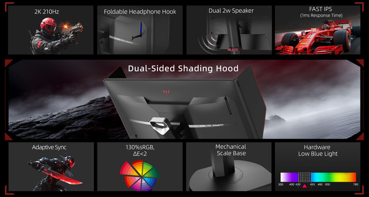 The 27-inch Fast IPS panel offers sharp 2K resolution, 210Hz refresh rate, and 1ms response for smooth, tear-free gameplay.Dual speakers, headset hook, base scale, and detachable side shields enhance both function and style.